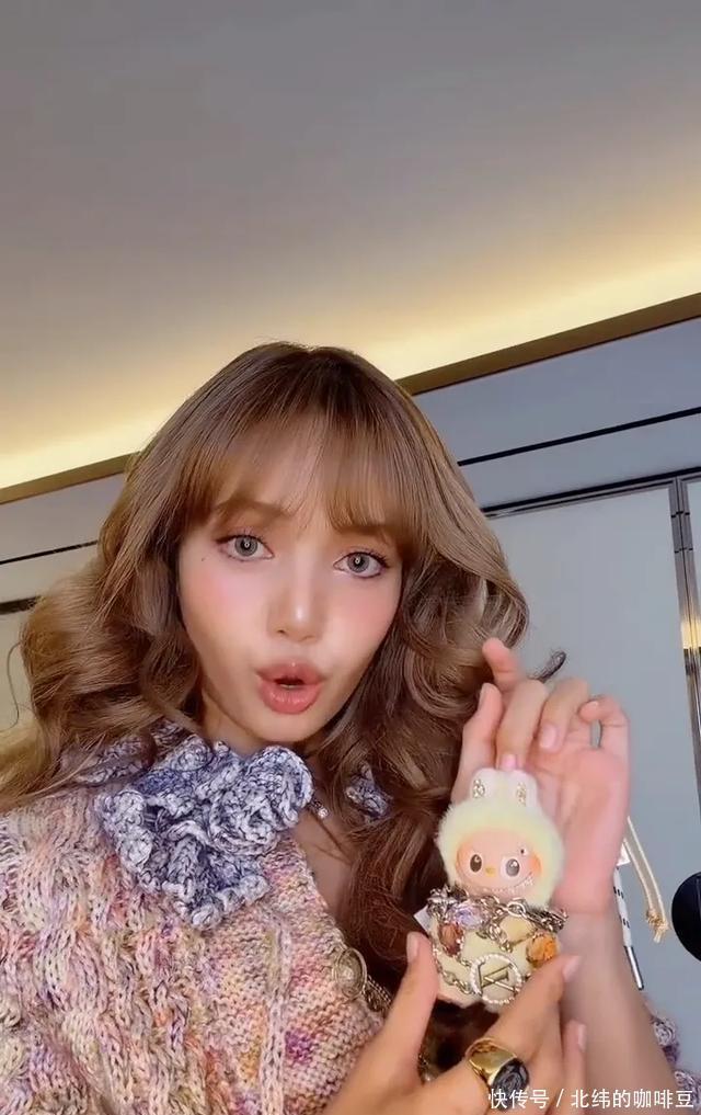 Lisa虽然穿衣大胆,但是内心仍是小女孩。Lisa拿着心爱的mini款Labubu,她给Labubu戴上了各种LV首饰,Labubu给她打扮的很贵气,这只Labubu连耳朵上都镶了钻。